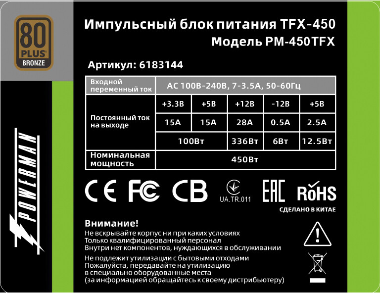 Блок питания 450W PowerMan PM-450TFX 80мм OEM по низкой цене с бесплатной доставкой по Москве (при покупке от 50 000 рублей). Вы можете купить за наличный и безналичный расчет, при этом стоимость не изменится.