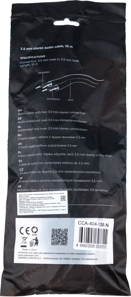 Описание Кабель 3.5 Jack (M) - 3.5 Jack (M), 10м, Cablexpert CCA-404-10M-N