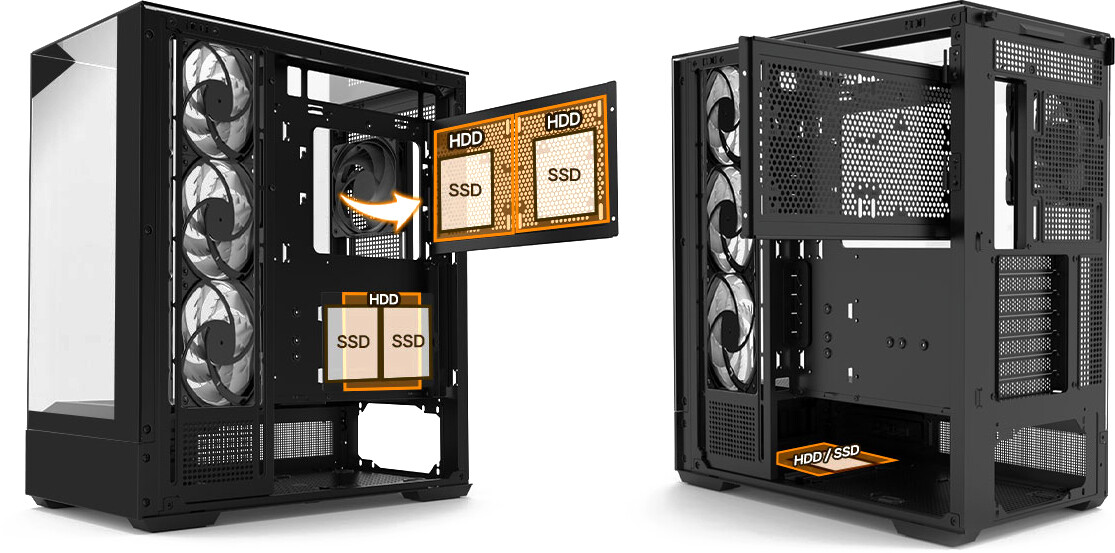 держатель видеокарты в комплекте, установка вентиляторов для охлаждения сокета с обратной стороны сокращает количество мест для HDD/SSD на 2