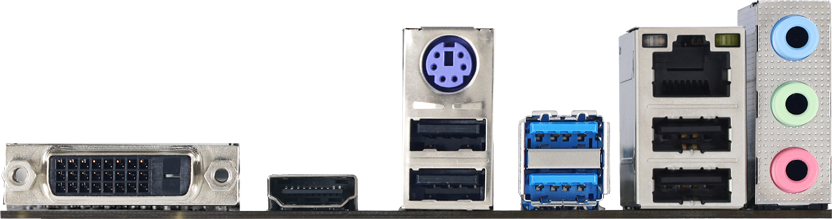 PS/2, 4 x USB 2.0, 2 x USB 3.2 Gen1, DVI, HDMI, RJ-45