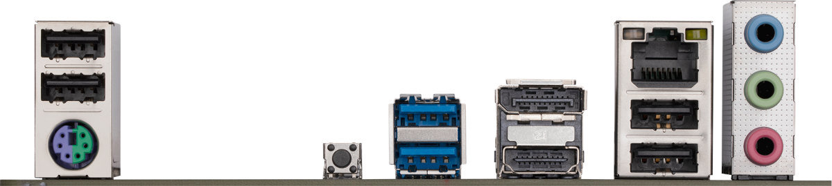 PS/2, 4 x USB 2.0, 2 x USB 3.2 Gen1, HDMI, DisplayPort, RJ-45