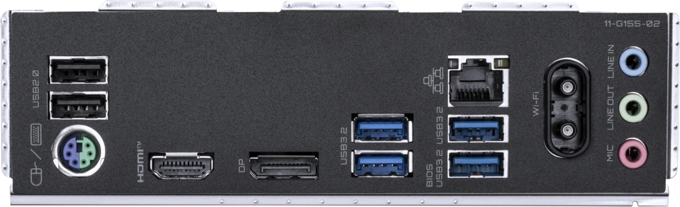PS/2, 2 x USB 2.0, 4 x USB 3.2 Gen1, HDMI, DisplayPort, RJ-45