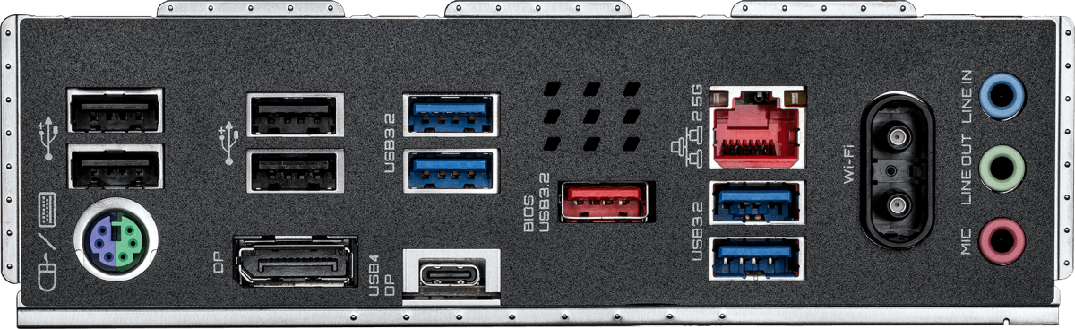 PS/2, 4 x USB 2.0, 4 x USB 3.2 Gen1, USB 3.2 Gen2, USB 4 Type-C, DisplayPort, RJ-45