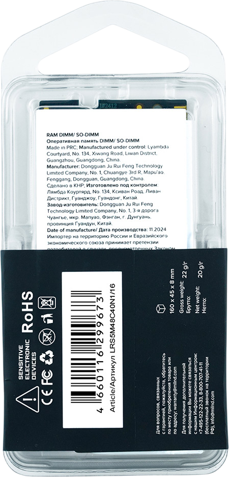Описание Оперативная память 16Gb DDR5 4800MHz Lyambda SO-DIMM (LRS5M48C40N1/16)