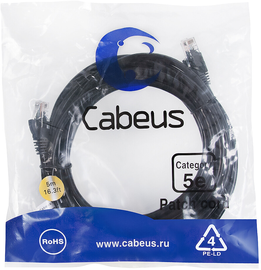 Описание Патч-корд Cabeus PC-UTP-RJ45-Cat.5e-5m-BK, 5м