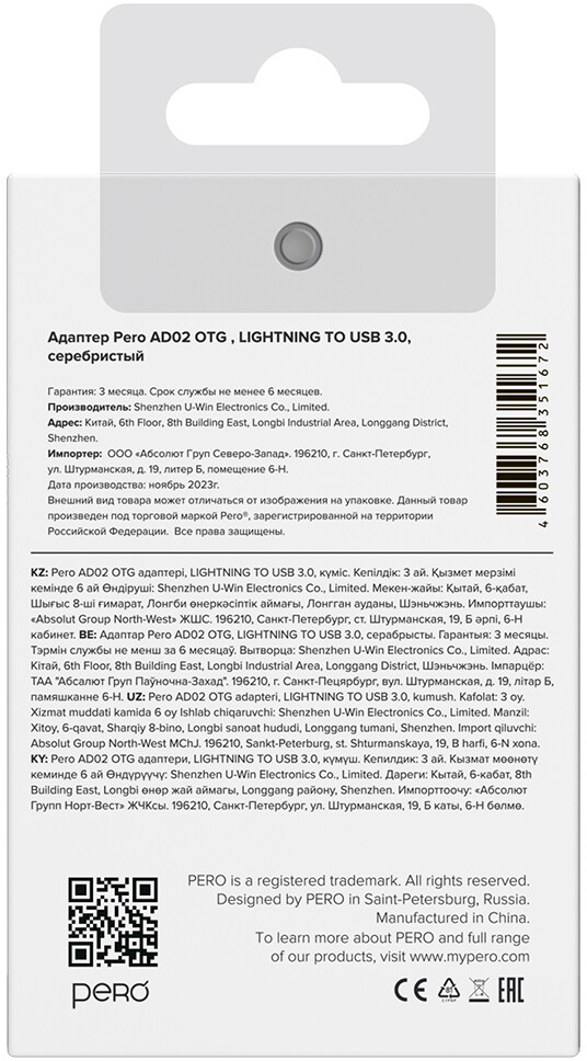 Переходник USB - Lightning, PERO AD02 Silver по низкой цене с бесплатной доставкой по Москве (при покупке от 50 000 рублей). Вы можете купить за наличный и безналичный расчет, при этом стоимость не изменится.