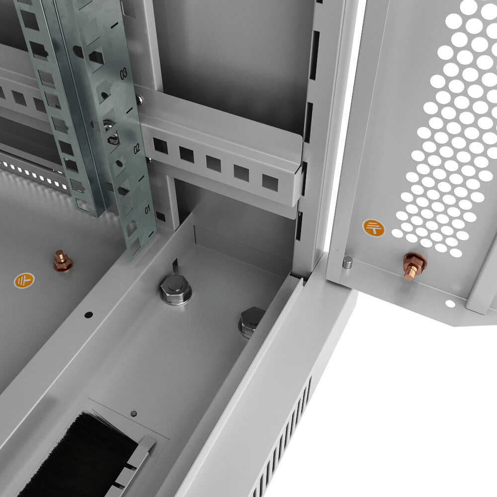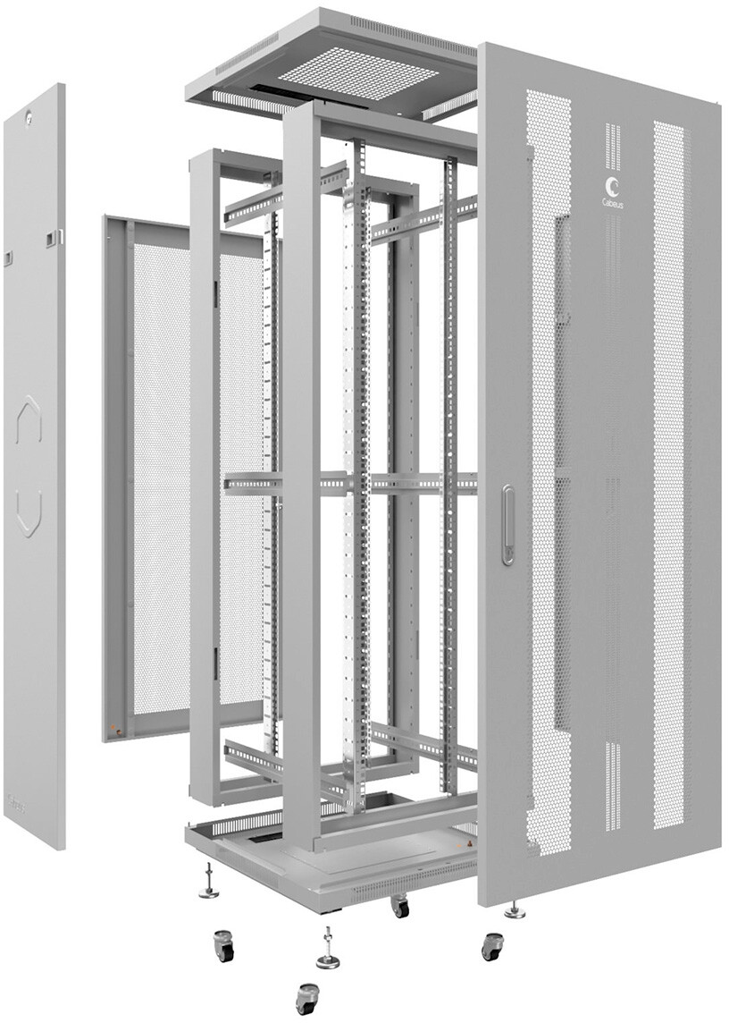 передняя дверь с замками, задняя дверь с замками, 2 боковые съемные панели, 2 пары 19" монтажных профилей, регулируемые и роликовые опоры, крепежный комплект 30шт.