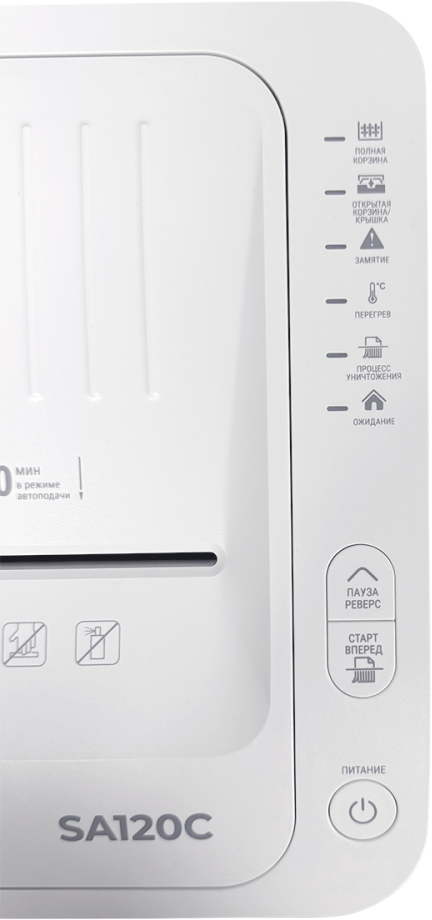 индикаторы: замятия, перегрева и перегрузки, открытой корзины, полной корзины, открытой крышки автоподачи; цикл работы в режиме ручной подачи 15 мин; цикл работы в режиме автоподачи 60 мин; количество уничтожаемых листов в режиме автоподачи до 120 шт.