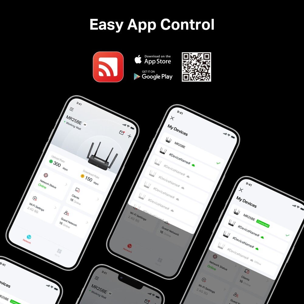 ширина канала: 160 МГц; модуляция 4096-QAM; поддержка OpenVPN; поддержка WireGuard; управление через приложение